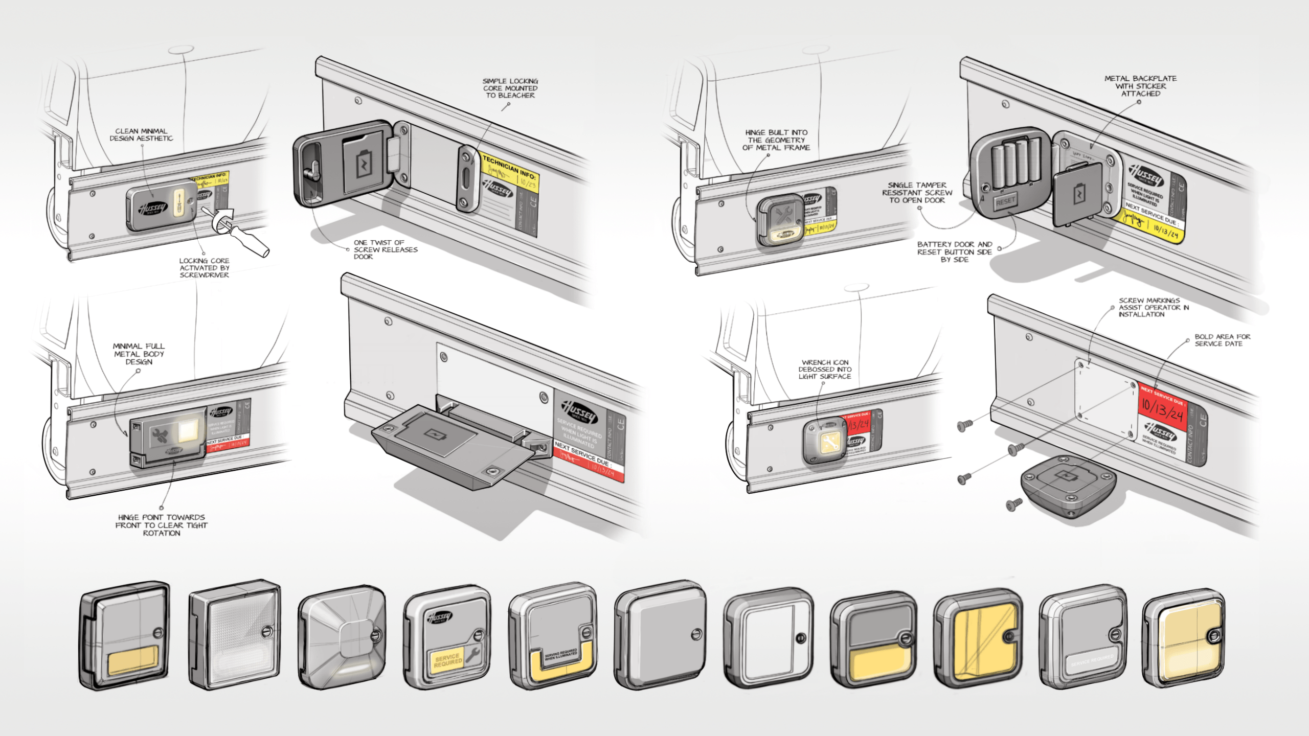Hussey Seating asked Tool to reimagine their Service Light, a small indicator mounted on bleacher skirt panels that signals when annual inspection is due. The original version relied on a PLC box and runtime tracking, making it too complex and too costly. Customers rarely used the advanced functions, which meant many banks of bleachers went without lights—undermining the goal of consistent safety checks. Hussey’s objective was clear: create a far more affordable, battery-powered unit that could be installed on every bleacher, powered or manual, and reset easily by a technician after service.