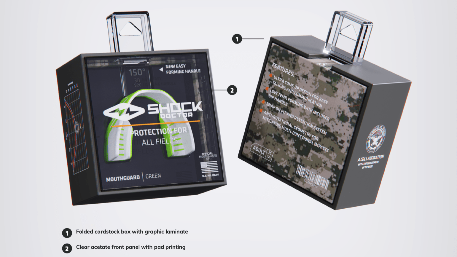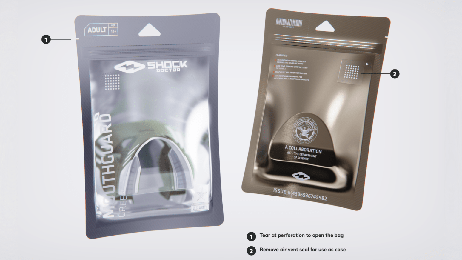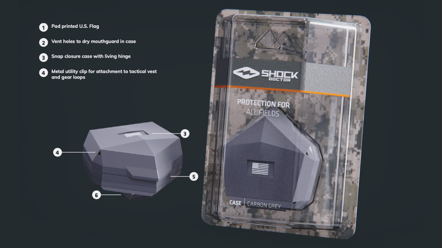 Through successive SBIR-funded phases, the project produced more than just a mouthguard. It established a validated methodology for testing impact mitigation, informed both military and consumer designs, and delivered a final product that now serves warfighters and athletes alike. Packaging was treated as an integral extension of the product, not an afterthought. Each concept balanced practical utility with strong brand storytelling. Ventilated storage, rugged carabiners, and modular inserts ensured the product was protected and easy to carry in real-world conditions, reinforcing the themes of readiness and adaptability.